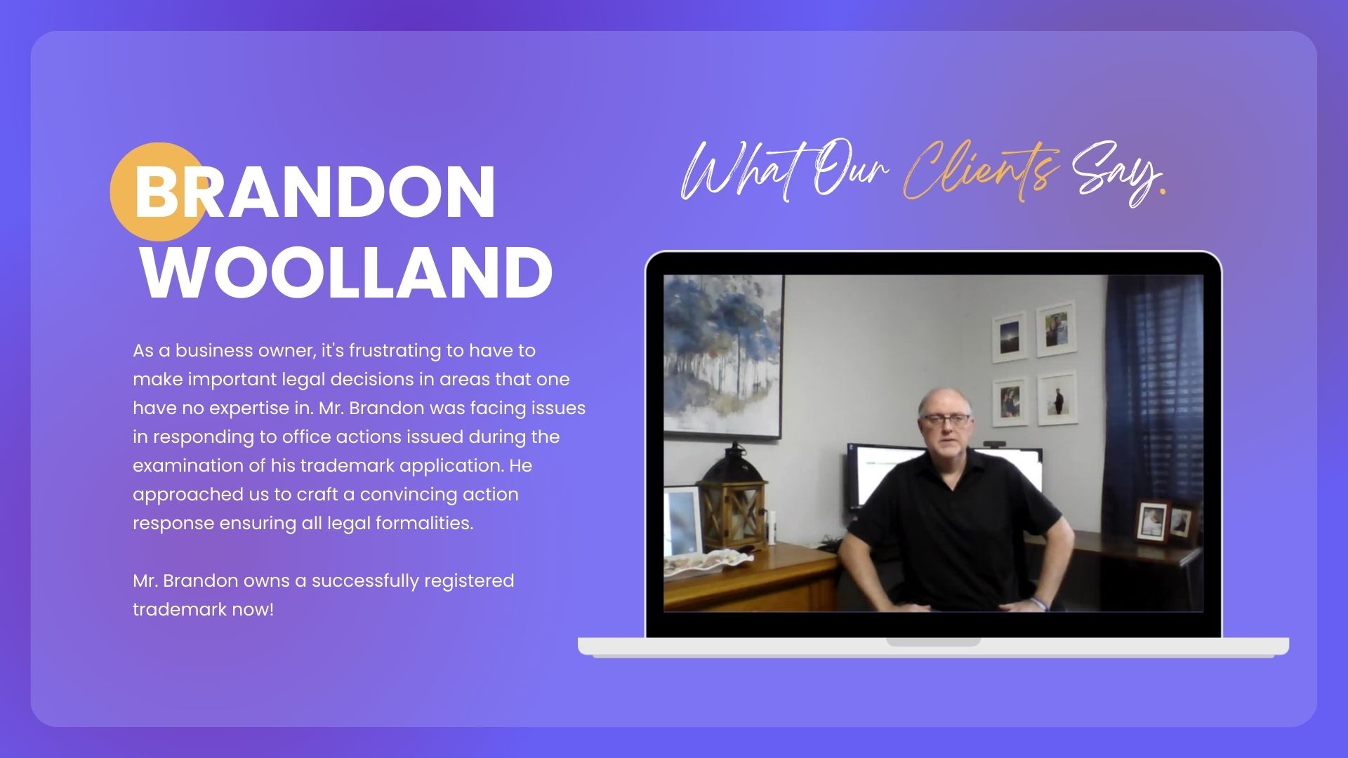 As a business owner, it's frustrating to have to make important legal decisions in areas that one have no expertise in. Mr. Brandon was facing issues in responding to office actions issued during the examination of his trademark application. He approached us to craft a convincing action response ensuring all legal formalities. Mr. Brandon owns a successfully registered trademark now!