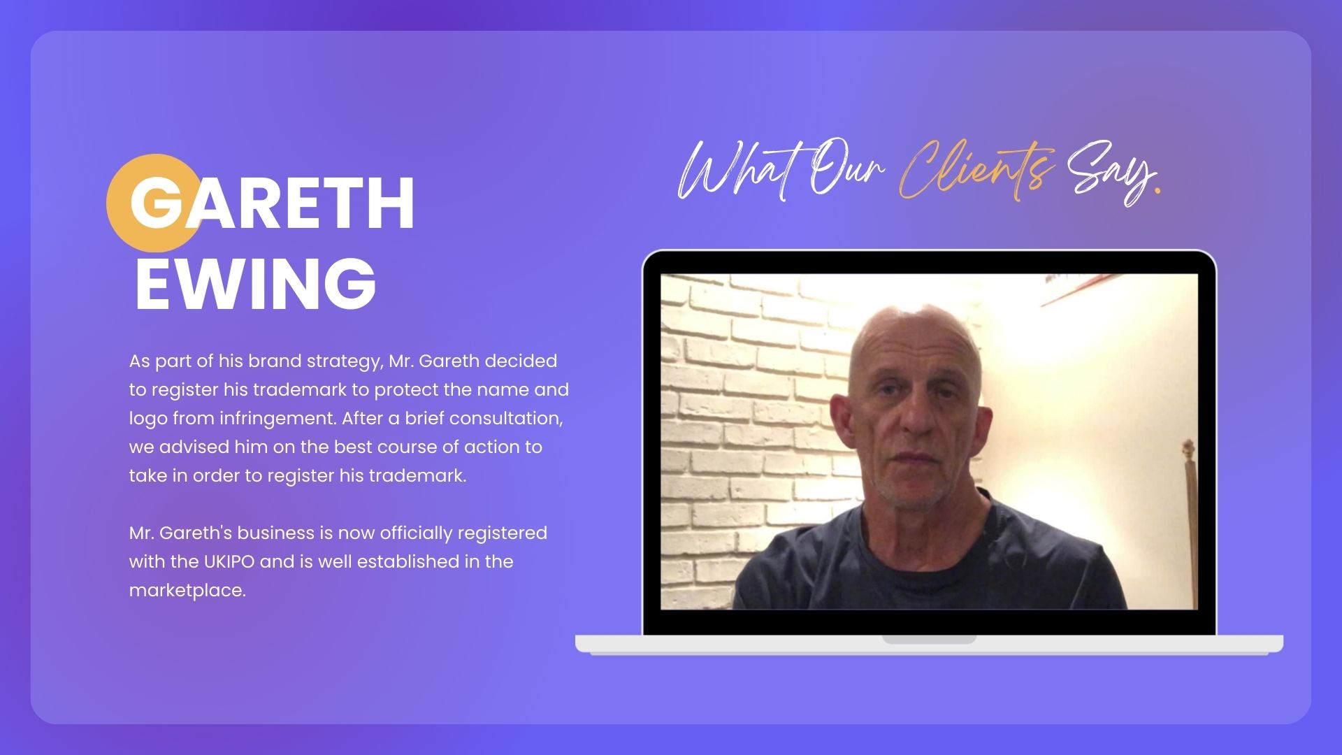 As part of his brand strategy, Mr. Gareth decided to register his trademark to protect the name and logo from infringement. After a brief consultation, we advised him on the best course of action to take in order to register his trademark. Mr. Gareth's business is now officially registered with the UKIPO and is well established in the marketplace.