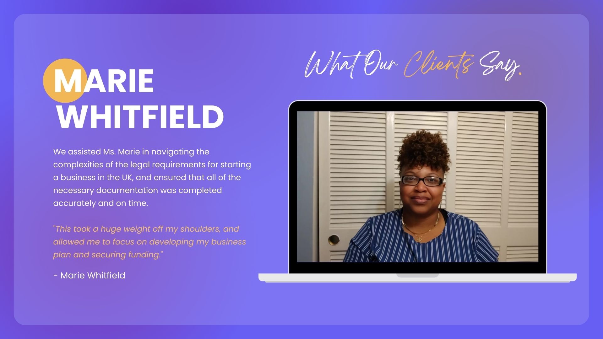 We assisted Ms. Marie in navigating the complexities of the legal requirements for starting a business in the UK, and ensured that all of the necessary documentation was completed accurately and on time. As per Ms. Marie: "This took a huge weight off my shoulders, and allowed me to focus on developing my business plan and securing funding."